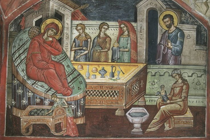 Традиционно на ранних иконах и фресках иконописцы изображали в центре композиции праведную Анну — мать Девы Марии. Роженица полулежит на высоком ложе, перед ней стоят женщины с дарами, акушерка и служанки, которые омывают Богородицу в купели.